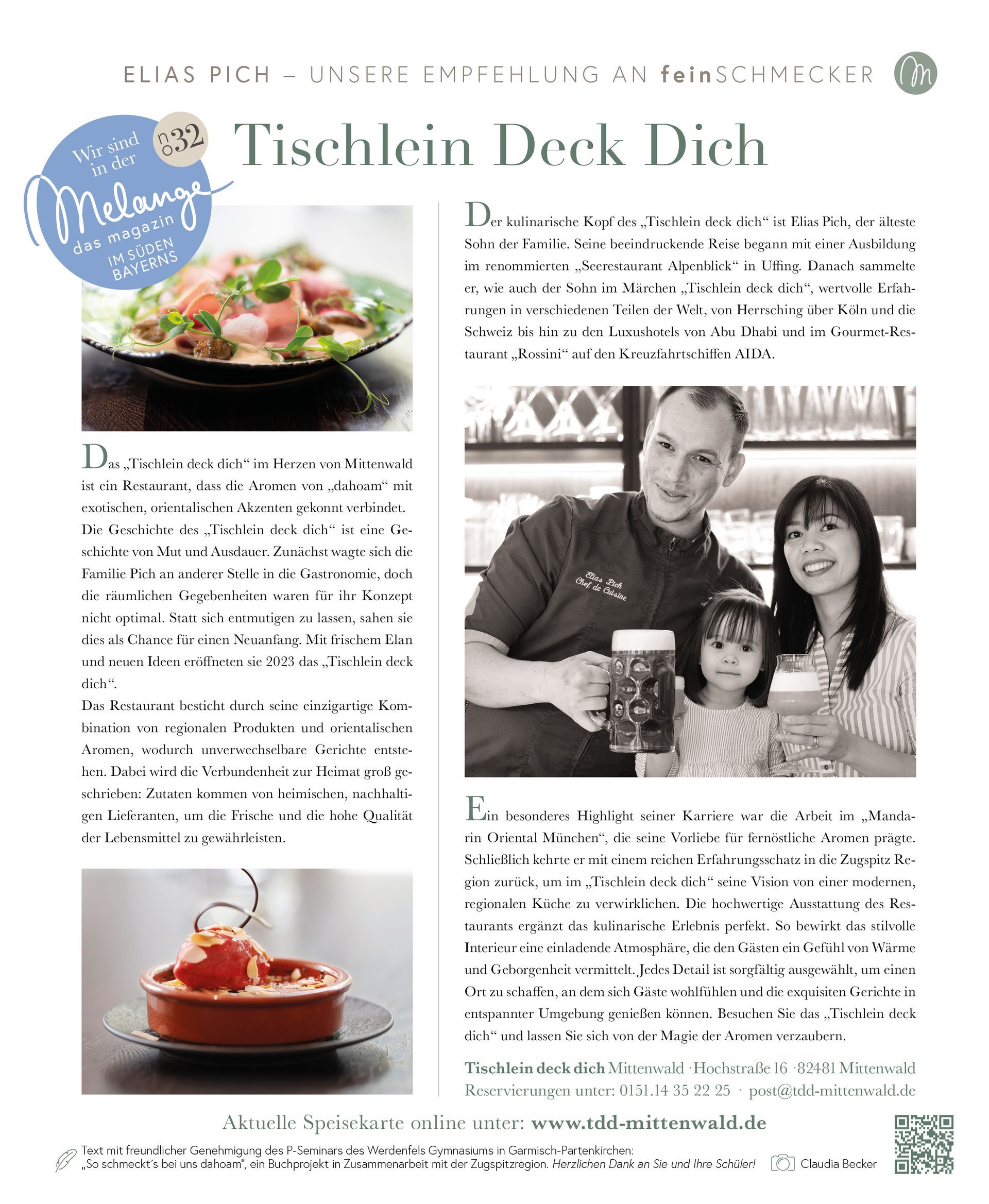 Tischlein deck dich - Mittenwald - ist ein kleines Restaurant im Herzen von Mittenwald. Das Tischlein deck dich steht für feine Küche mit einem besonderen Augenmerk auf vegetarisch / vegan Küche. Regionale Produkte, internationale Akzente, familiäre Atmosphäre und ein schönes Ambiente laden Sie ein.
